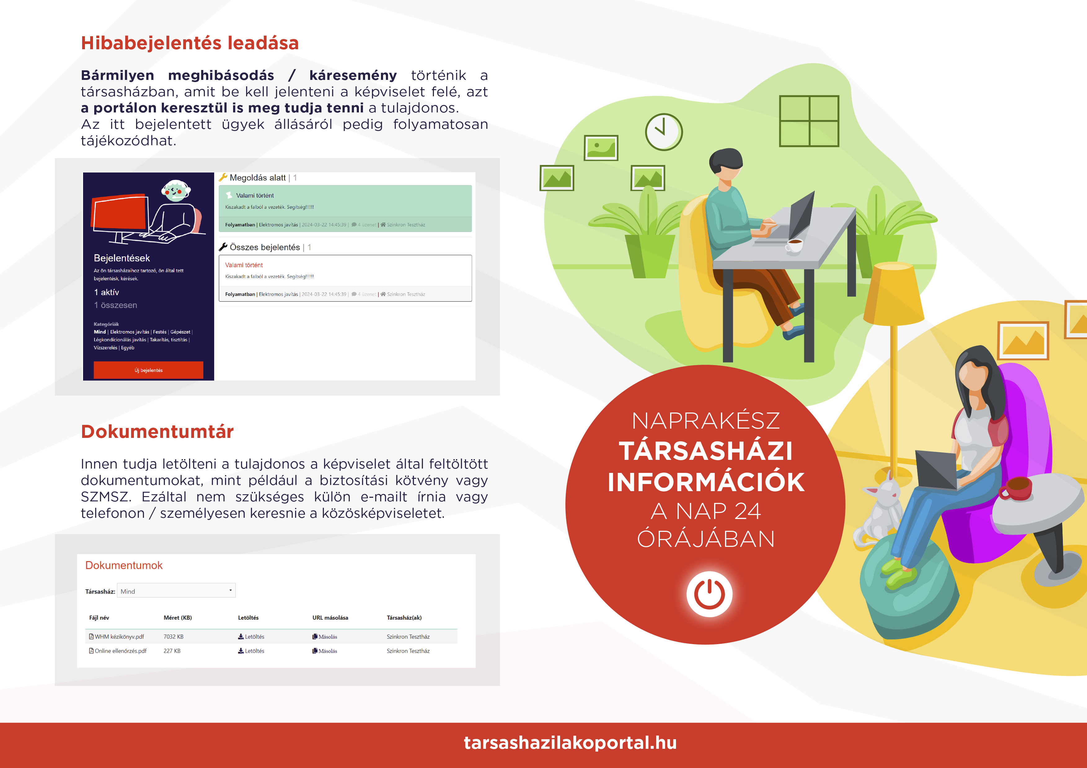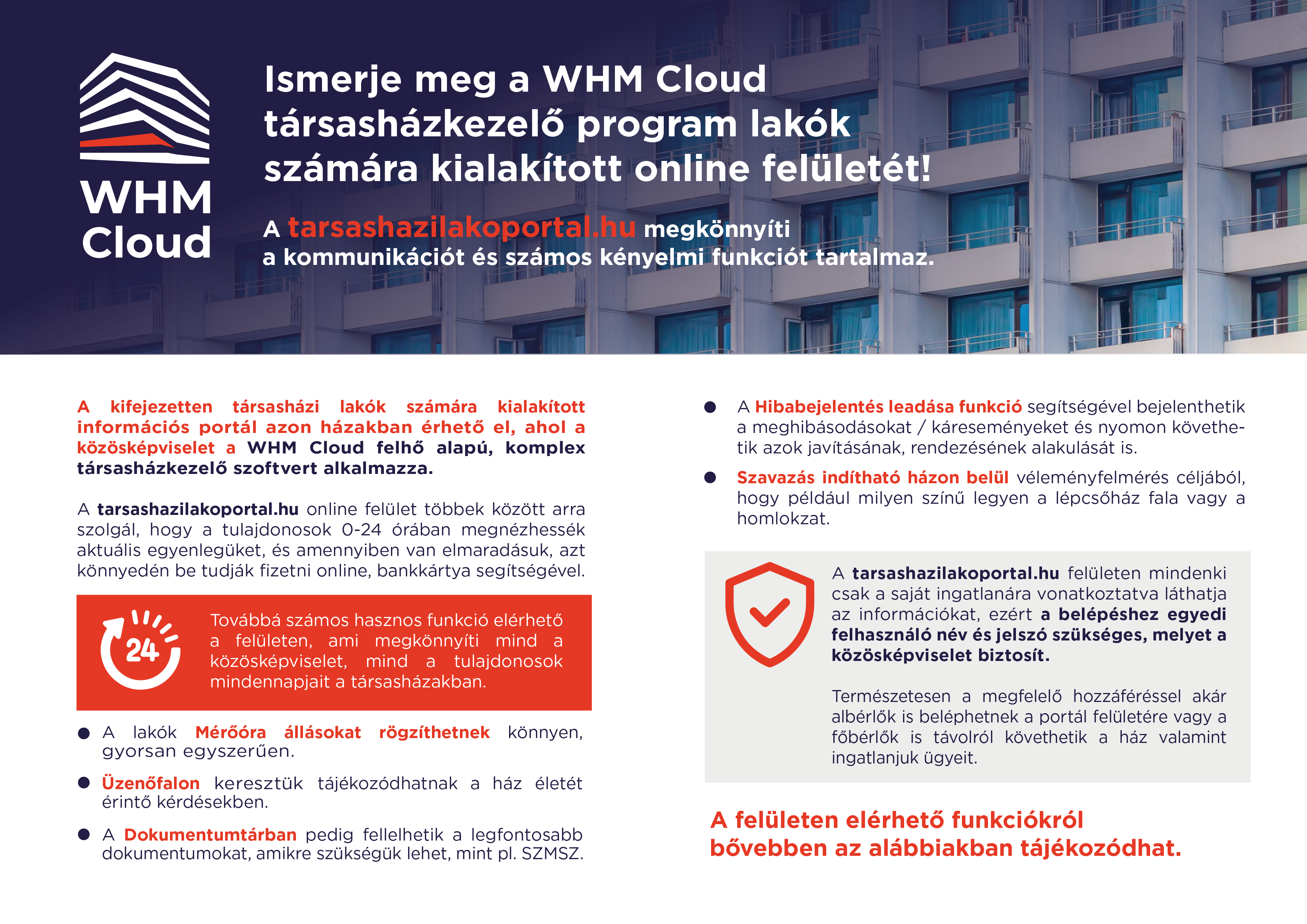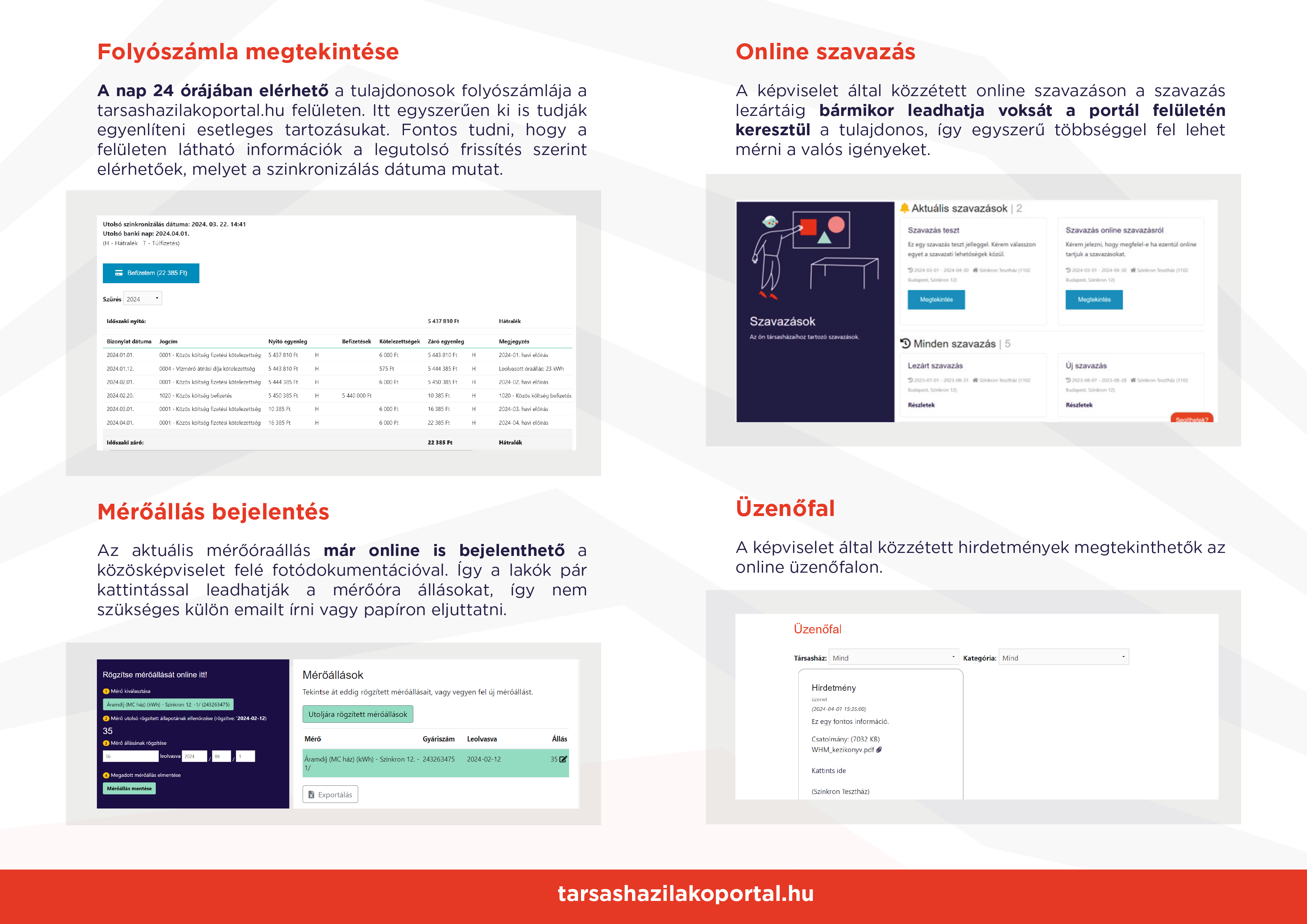 Napi 0-24 órában elérheti az Önhöz tartozó albetétek (lakások, irodák stb.) legfontosabb pénzügyi és egyéb adatait.